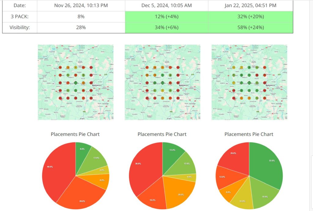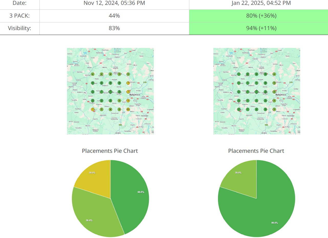 Początkowo widoczność dla tej frazy była bardzo niska – tylko 8% w TOP 3 i 28% ogólnej widoczności. Mimo trudnego startu, dzięki tej samej strategii (opartej na optymalizacji wizytówki, NAP-ach i tematycznych wpisach) w ciągu zaledwie dwóch miesięcy osiągnęliśmy 32% w TOP 3 i 58% widoczności.