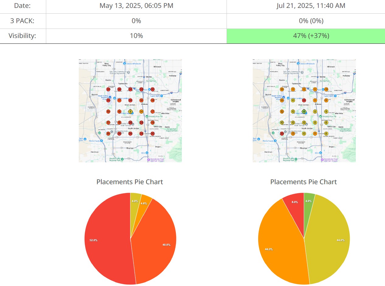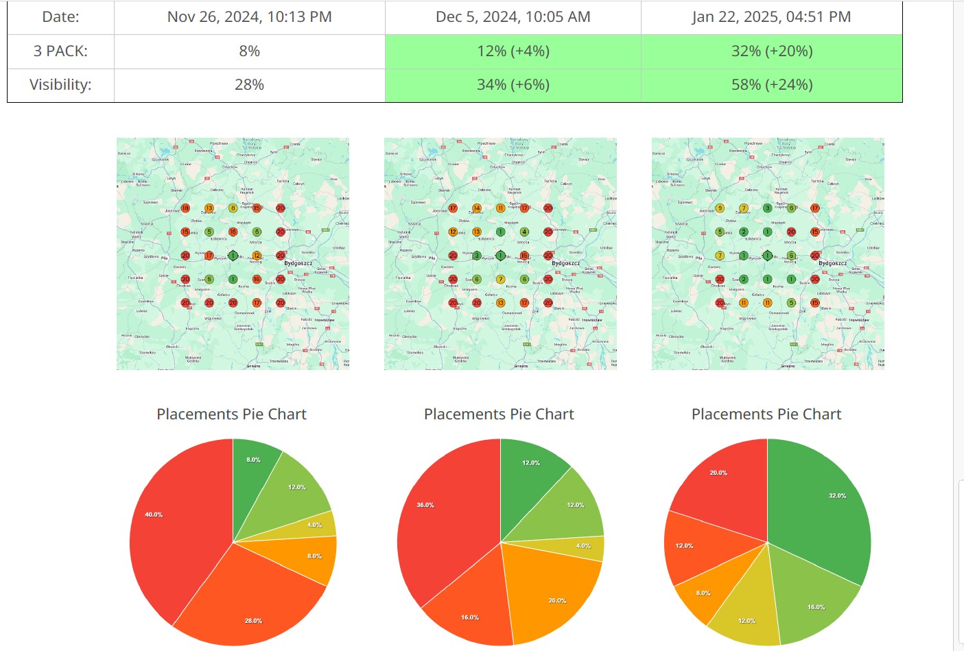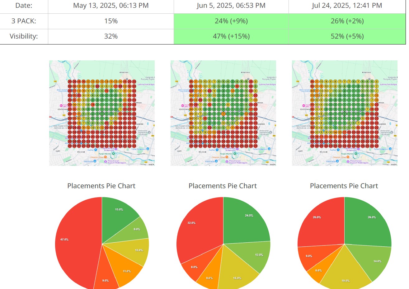 W niespełna 2 miesiące widoczność wzrosła z 15% do 26% w Top 3 (3-Pack) i z 32% do 52% ogólnej widoczności.